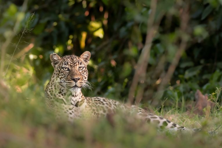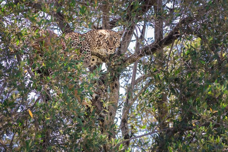 The riverine forest and dense thickets surrounding Governors’ Camp constitute reliable leopard country. Here, guests may view them draped across tree limbs, paused mid-stride through dense cover, or carrying a meal into the branches to get it away from hyenas.