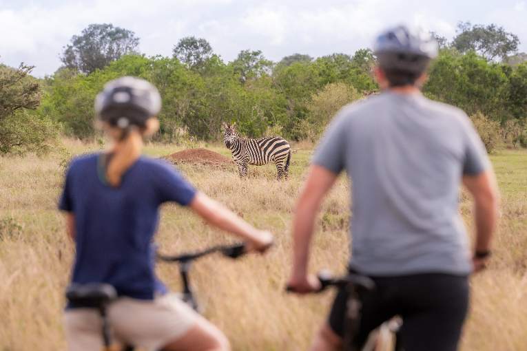 Activities at Mugie include day and night game drives, e-bike safaris, canoeing on Mugie Dam, guided bush walks, lion tracking, anti-poaching demonstrations, Pokot and Samburu community visits, scenic sundowners, and golf on the nine-hole course. Endangered species such as Grevy’s zebra, Beisa oryx, Jackson’s hartebeest, and reticulated giraffe are visible.