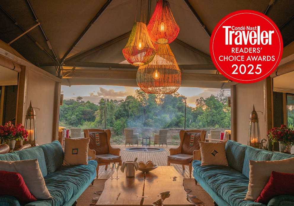 The camp features unique decor with dark wooden tables, oversized blue couches, and a central, colorfully beaded chandelier, creating an ambiance that is both elegant and adventurous. Tribal portraits and African artifacts enhance the atmosphere, adding to the camp’s charm. Meals are served on the raised wooden decking of the main mess and dining tent, providing a bird’s-eye view of the Mara River and its resident hippos. A central sunken fire pit is lit in the evenings, offering the perfect place to relax with a cocktail.