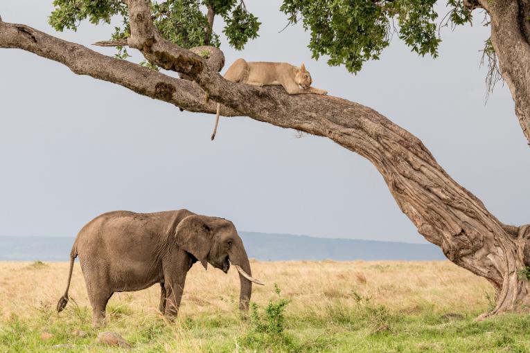 Elephant and lion encounter in the Mara – photo credit Will Fortescue