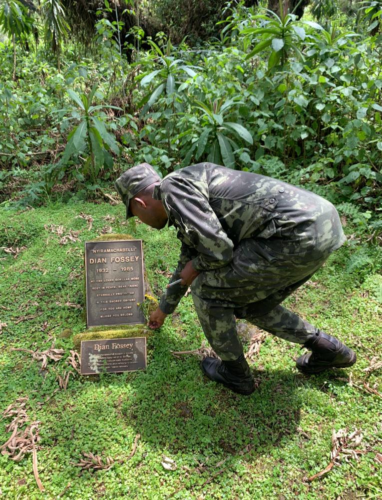 Park Warden Francis Bayingana placing a flower on the grave of Dian Fossey.
