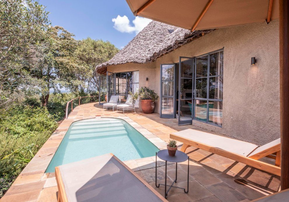 Perched atop a scenic hill, Governors’ Mugie House features seven beautifully designed stone cottages, each offering panoramic views of the stunning Laikipia landscape. Guests can unwind in the spacious main house with open log fires, savour gourmet meals, and enjoy refreshing dips in the infinity pool. The lodge overlooks a waterhole that attracts an array of wildlife, providing guests with incredible game-viewing opportunities from the comfort of their accommodation.
